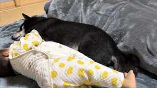 子育て 布団を占領された黒柴まめ。姉妹が夢中になったアンパンマンブロックの夕方
