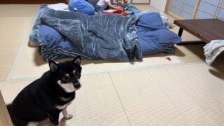 保育園帰りの夕方、布団でくつろいでいた黒柴まめが姉妹に占領される事件発生。二人が仲良く遊んでいたアンパンマンブロックが優秀すぎた話。