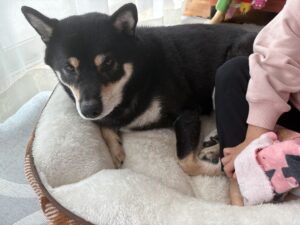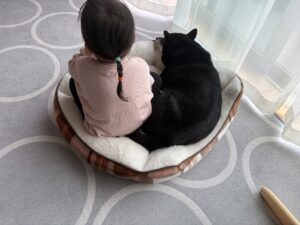 子どもと黒柴まめが一緒にペットベッドに座ってくつろいでいる姿 子育て