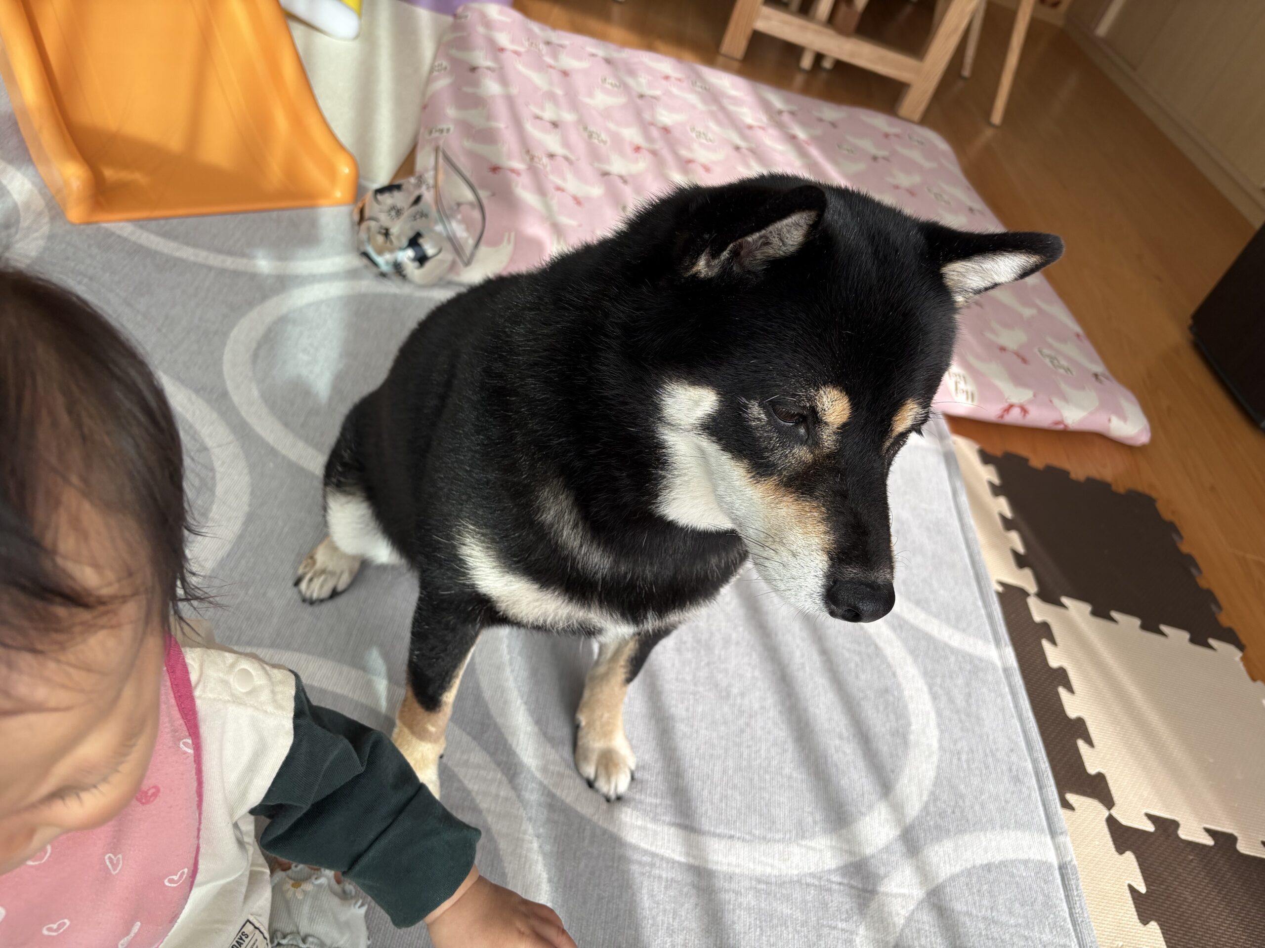 疲れはてた私のおやつを狙う、下の子と黒柴まめ…🍪🐕