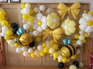 黄色と白を基調に、蜂さんの風船と大きなリボンで一気に華やか!