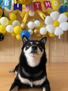 🖋 altテキスト:「誕生日会の飾りつけ前でおすましポーズのまめ」