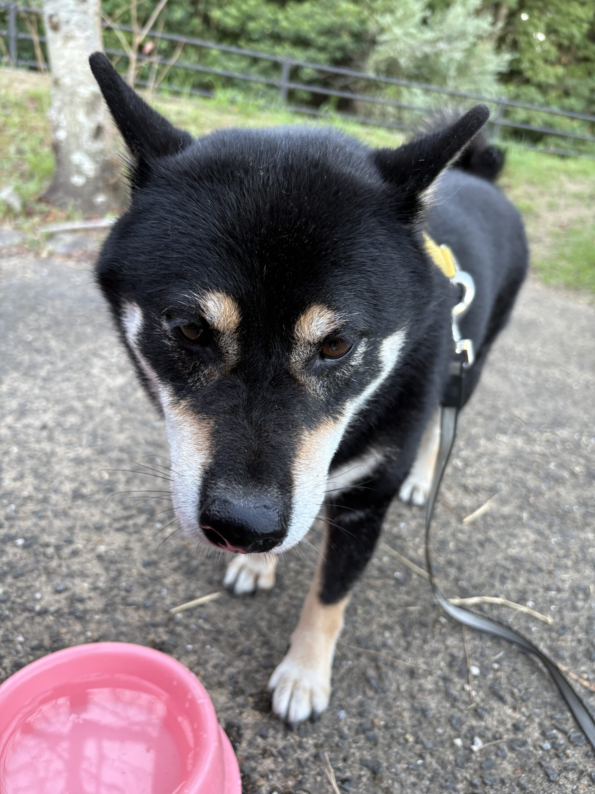 📝 alt(代替テキスト):「水皿の前でじっと見つめる黒柴」