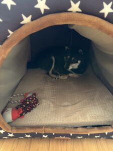 黒柴まめがペットハウスでくつろぐ様子。年中使える快適ドームベッド。 まめとの出来事